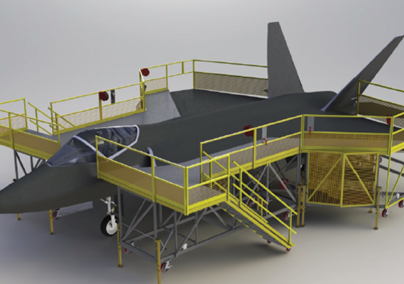 Custom-built or modular work platforms designed for safe, stable access to aircraft surfaces, with integrated guardrails or fall restraint systems.