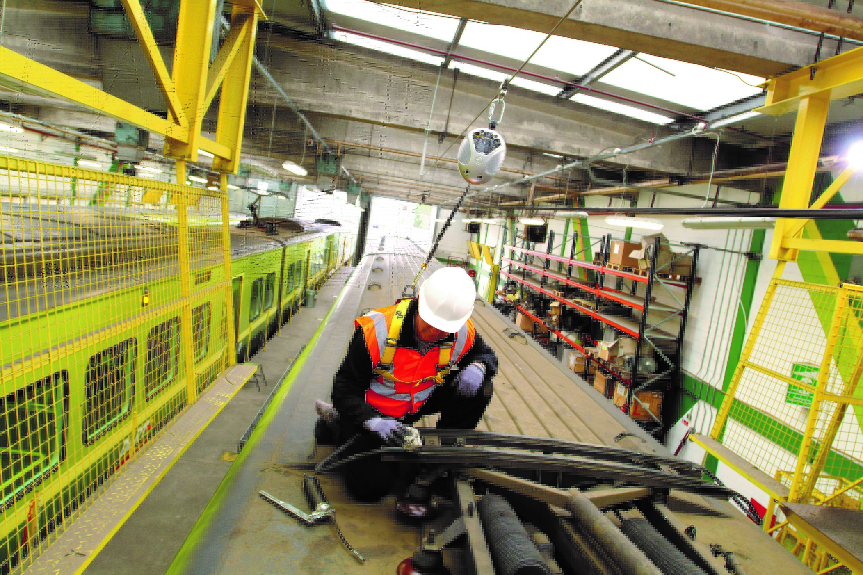 Overhead cable systems that provide continuous fall protection as workers move along the tops of railcars or trailers.
